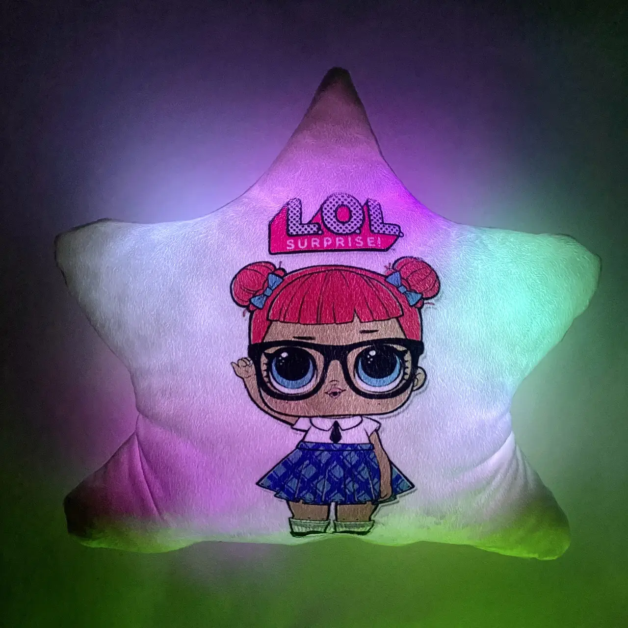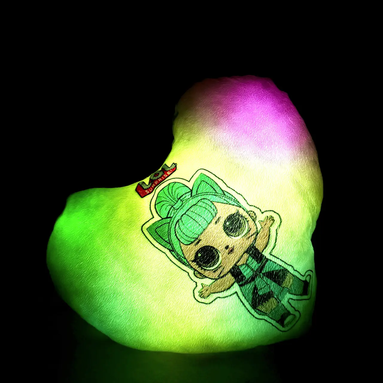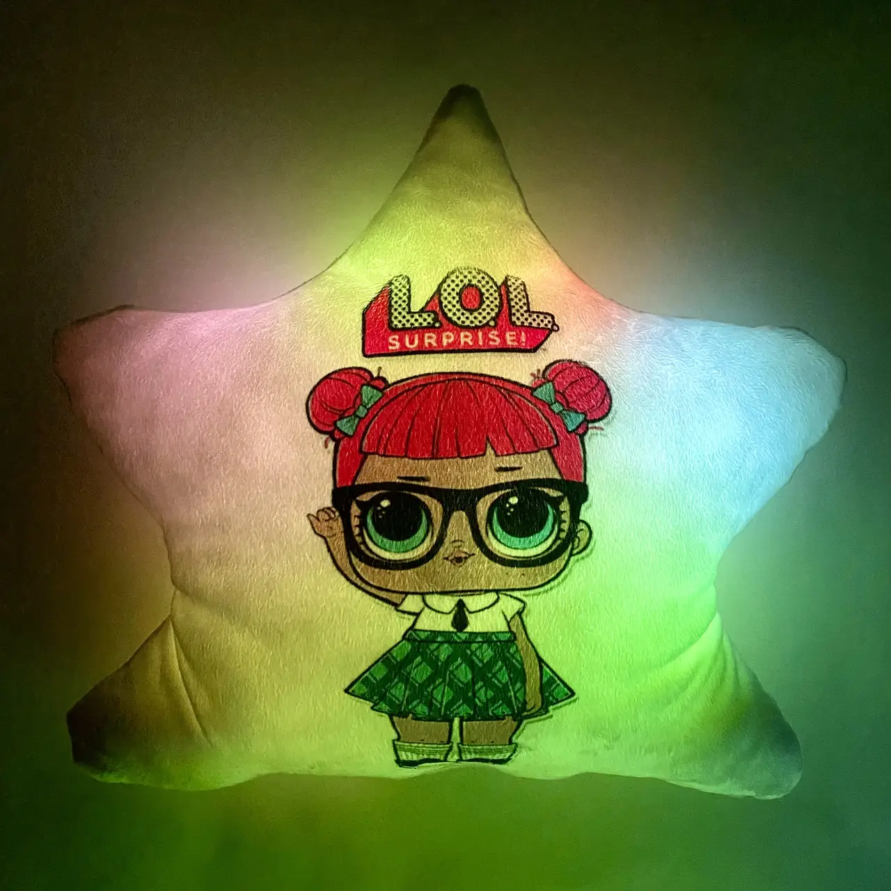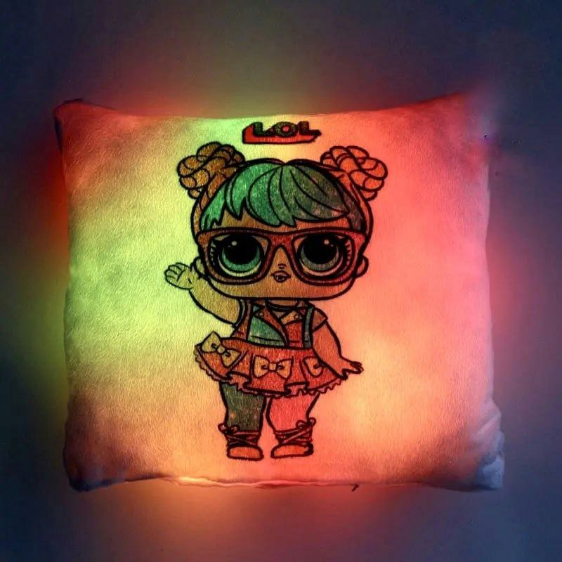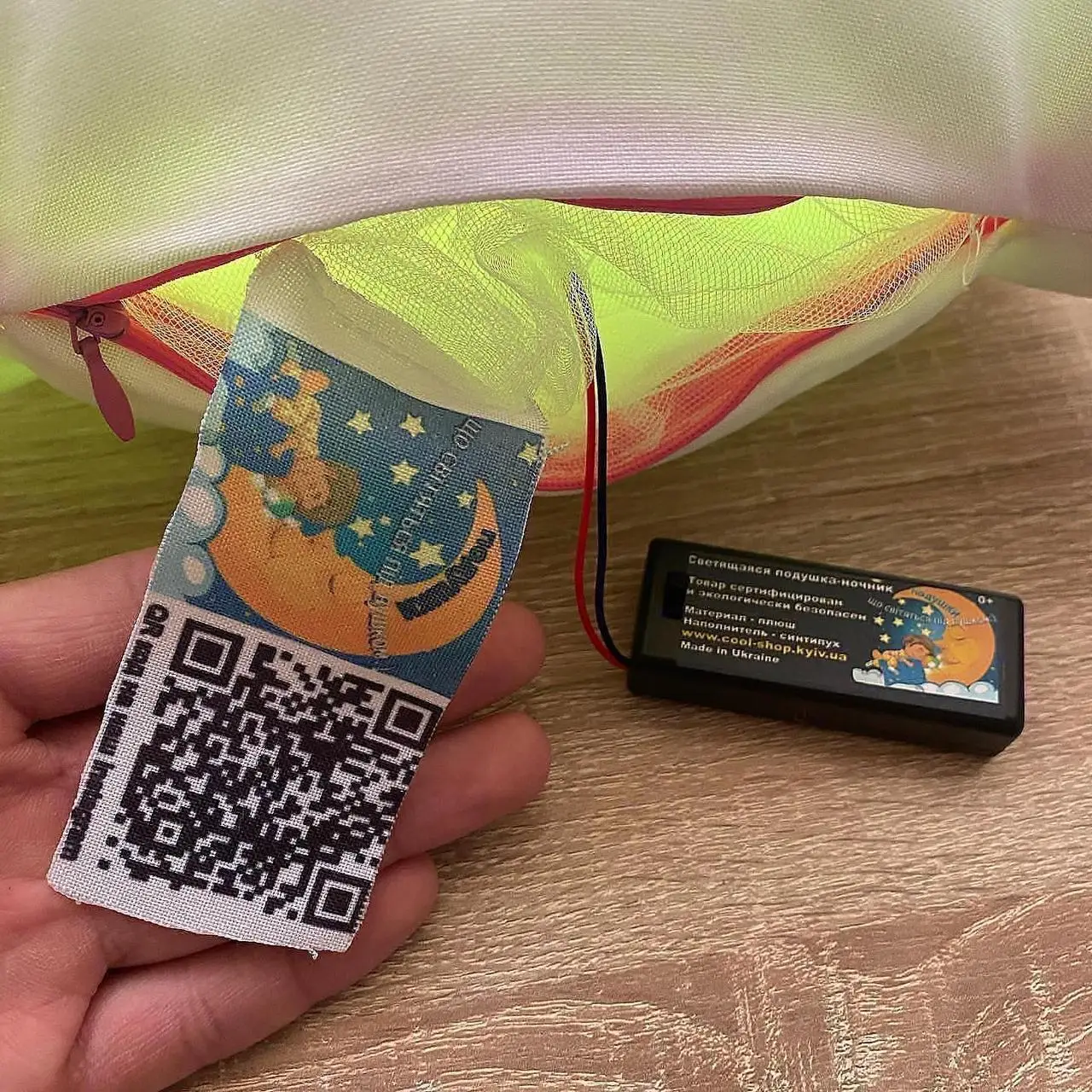 Переваги : Подушка сяє за допомогою блока живлення, міні led-лампочок і 2-х батарей ААА.