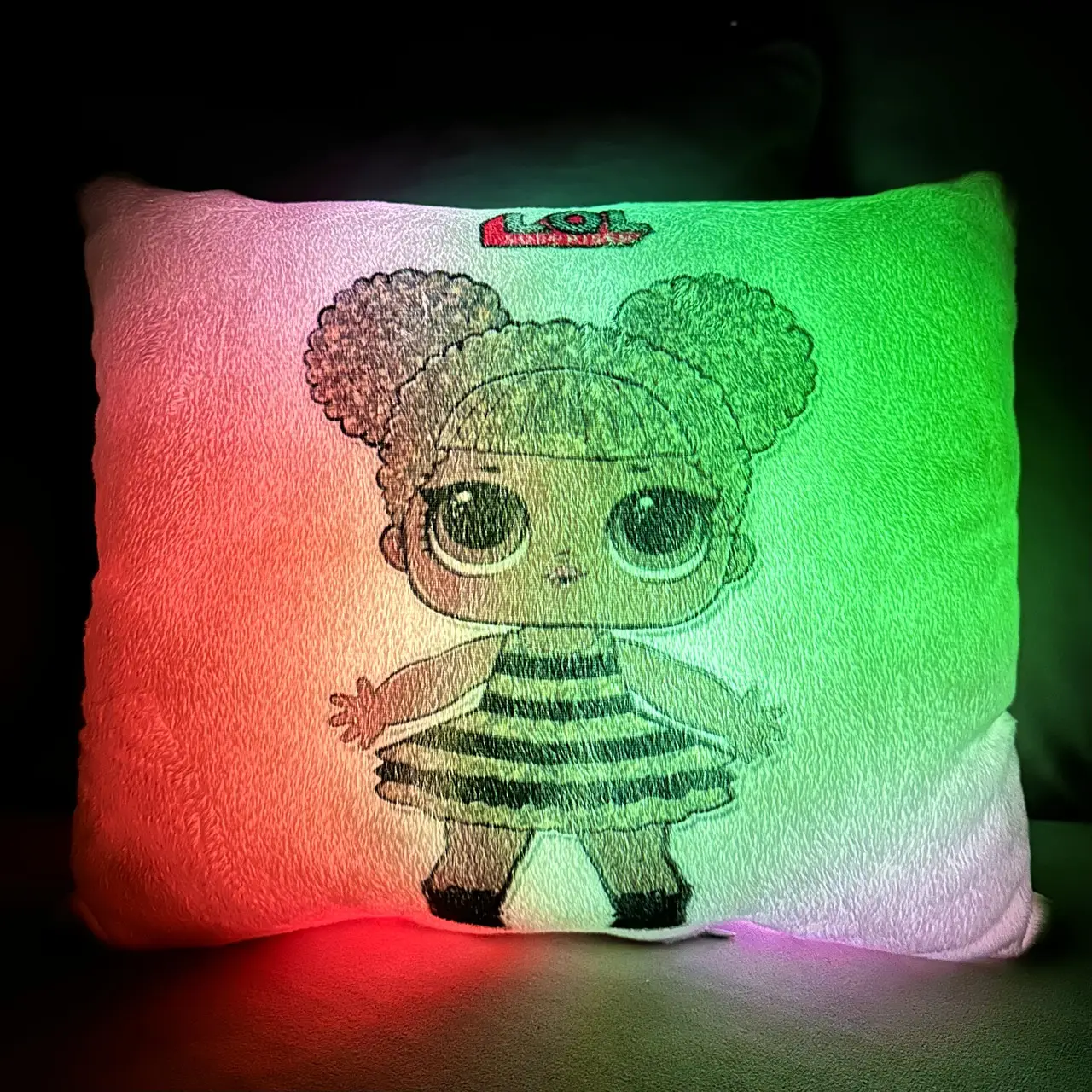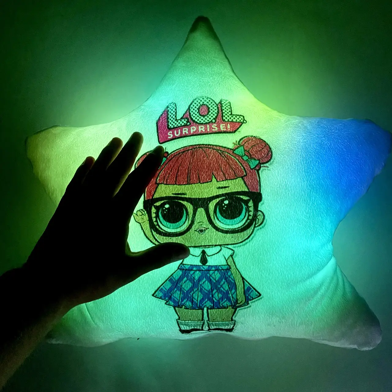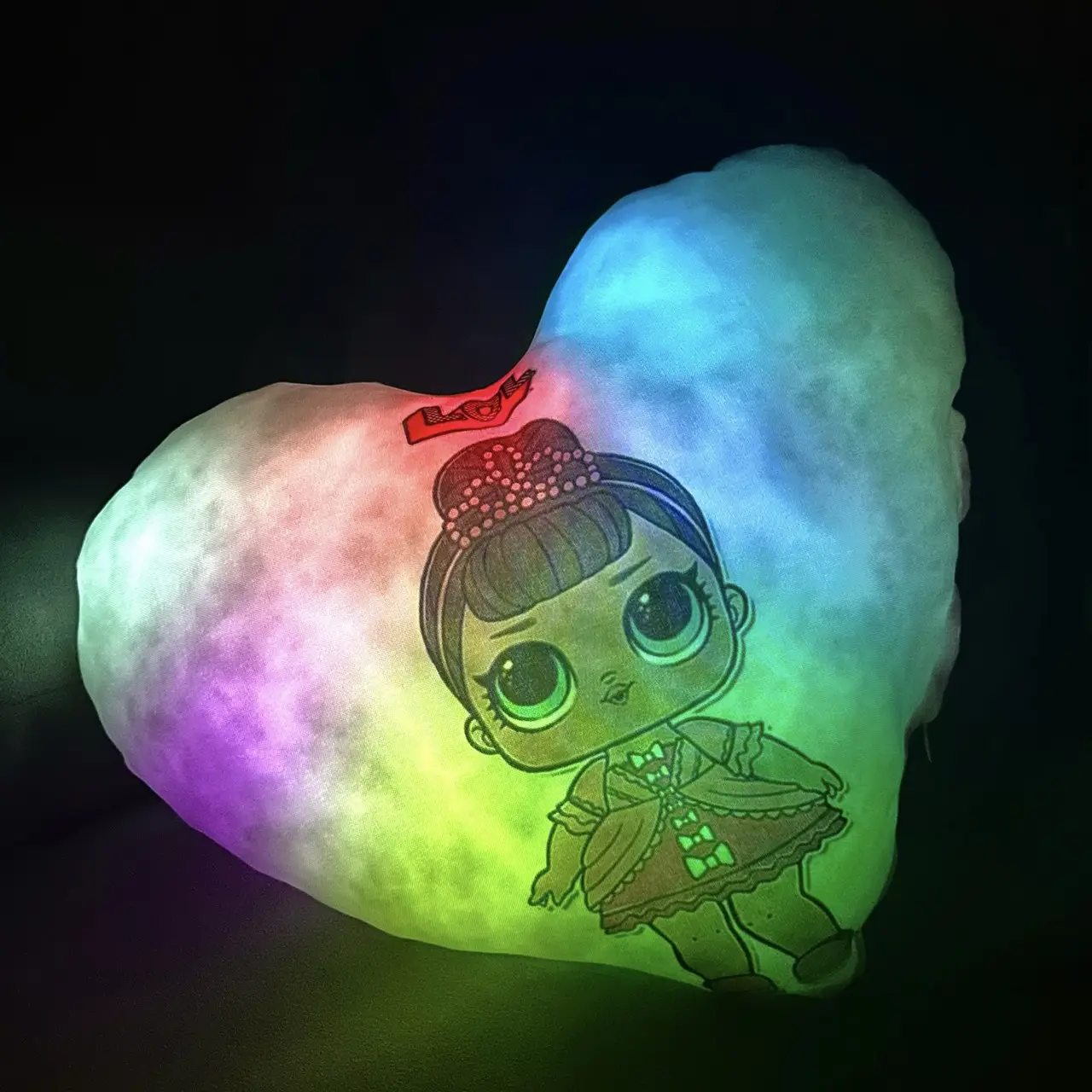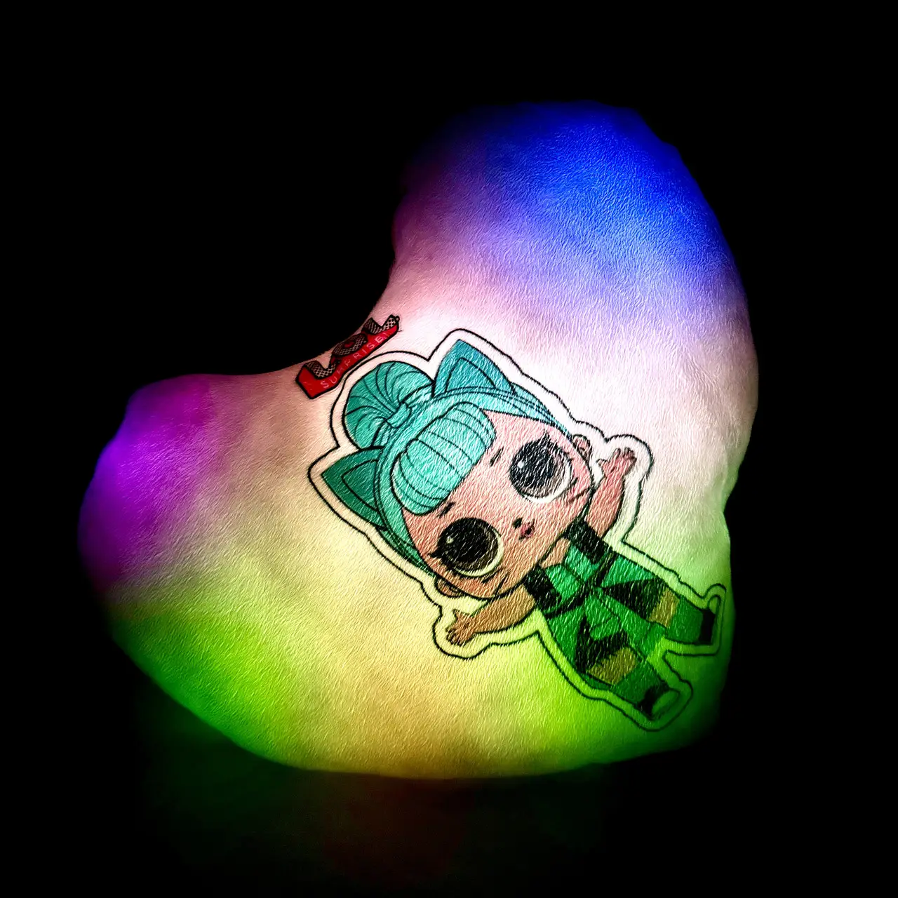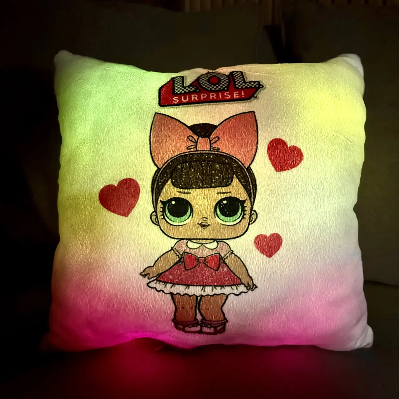 Переваги : Подушка сяє за допомогою блока живлення, міні led-лампочок і 2-х батарей ААА.